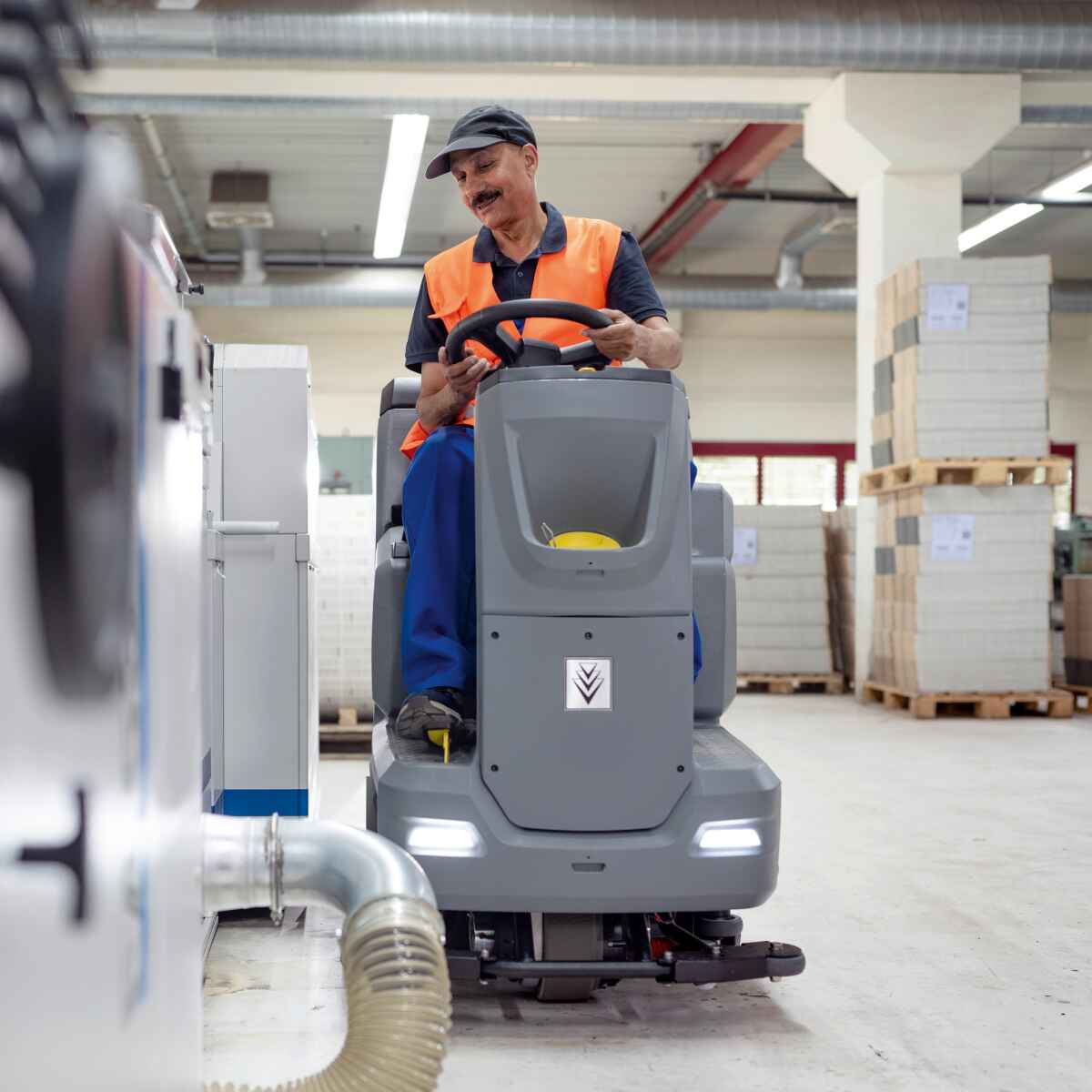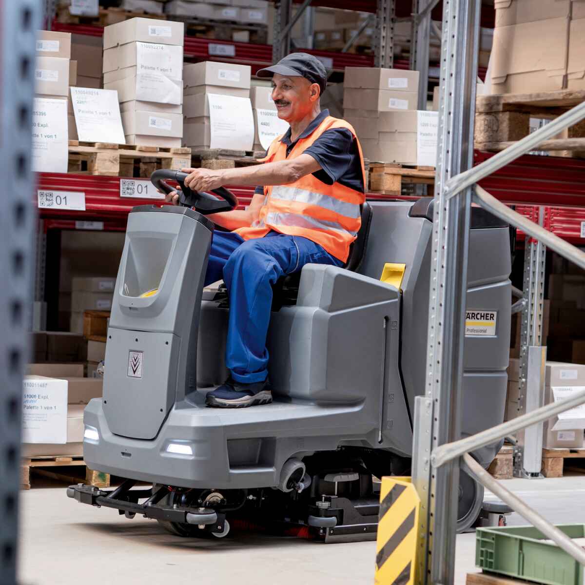Potente y muy fácil de usar: nuestra fregadora con hombre a bordo a batería BD 75/120 R Classic Bp con tecnología de cepillos de disco y una anchura de trabajo de 75 centímetros para tareas de limpieza en supermercados, centros comerciales, hospitales o incluso en áreas de producción y almacenes. Los elementos de mando codificados por colores permiten un manejo extremadamente sencillo. A ello contribuye el innovador sistema de llave KIK, que prácticamente excluye cualquier error de manejo. Y la dosificación de agua en función de la velocidad garantiza un consumo reducido que se puede adaptar en cualquier momento. El usuario también se beneficia de las luces de conducción diurna para aumentar la seguridad pasiva.