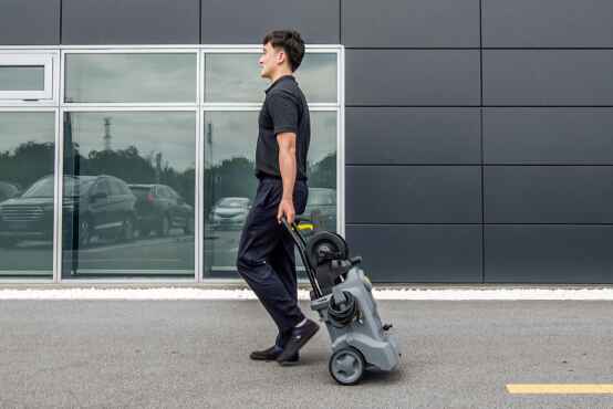 Las robustas ruedas D180 son ideales para aplicaciones difíciles. Asa extensible para un transporte cómodo en distancias cortas. Un asa adicional facilita el transporte de la máquina para subir escalones.