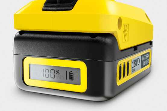 Tecnología en tiempo real con pantalla LCD en batería: tiempo de funcionamiento restante, tiempo de carga restante y capacidad de la batería. Duradero y potente gracias a las células de iones de litio. Compatible con todos los dispositivos del Kärcher de 18 V con Plataforma de batería Battery Power.
