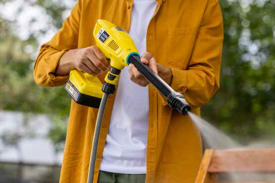 La hidrolavadora manual KHB 4-18 es la solución portátil perfecta para limpiezas intermedias en cualquier rincón del hogar. Funciona con batería y cuenta con una pantalla LCD que indica el tiempo restante operativo, carga y nivel de batería. Su diseño ultraligero (1,3 kg) y ergonómico lo hace cómodo de sostener, mientras que el sistema Quick‑Connect permite intercambiar boquillas con rapidez.